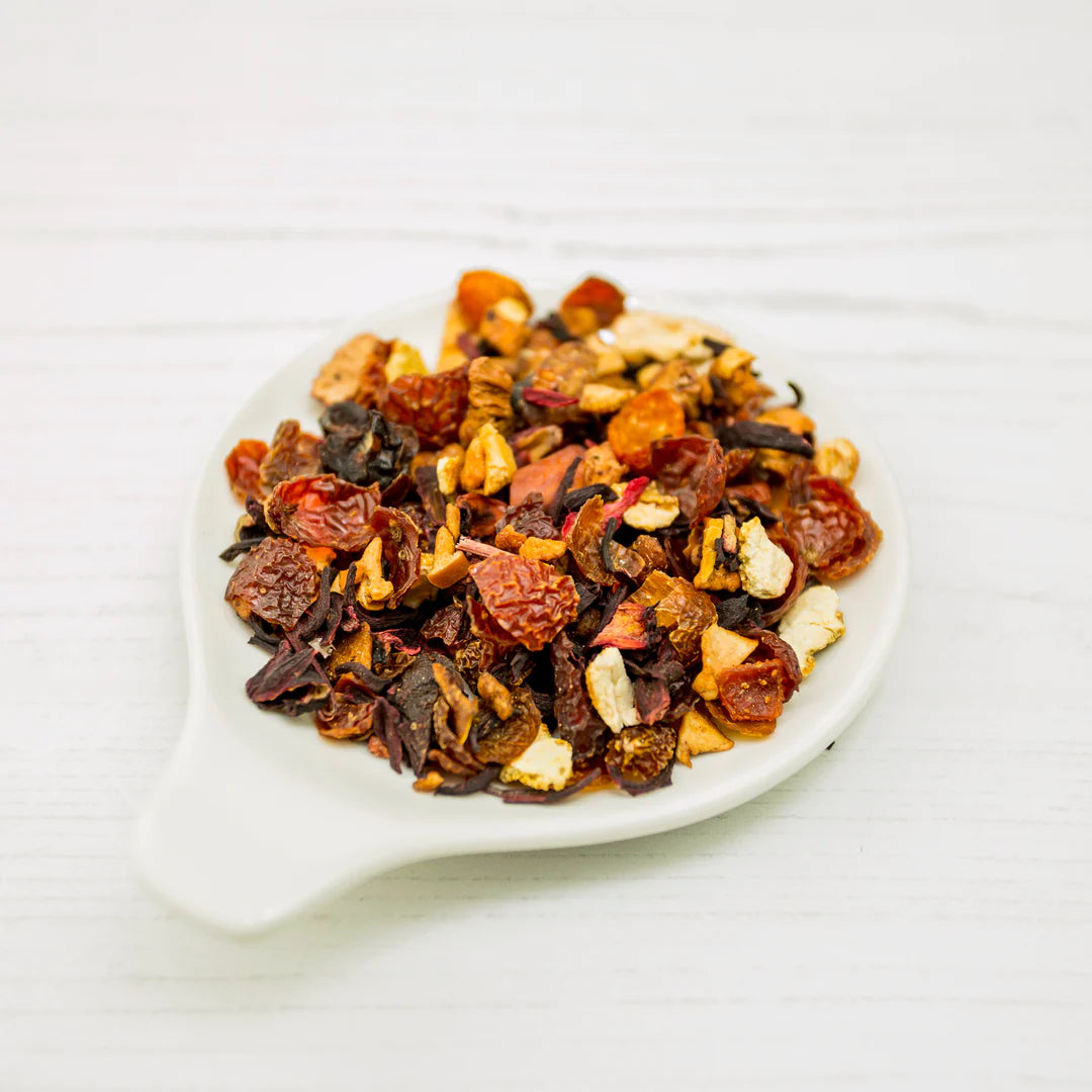 A vibrant infusion bursting with citrus aroma and tart berry flavour. Naturally caffeine-free and rich in vitamins, this thirst-quenching beauty is great for adults and kids and is delicious served iced.